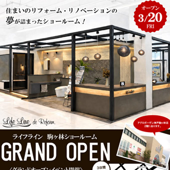 駒ヶ林ショールーム グランドオープンライフライン駒ヶ林ショールームは、より快適に、より相談しやすい空間へと生まれ変わり、リニューアルオープンいたします。つきましては、3月20日(金)より3日間、リニューアルオープンイベントを開催いたします。