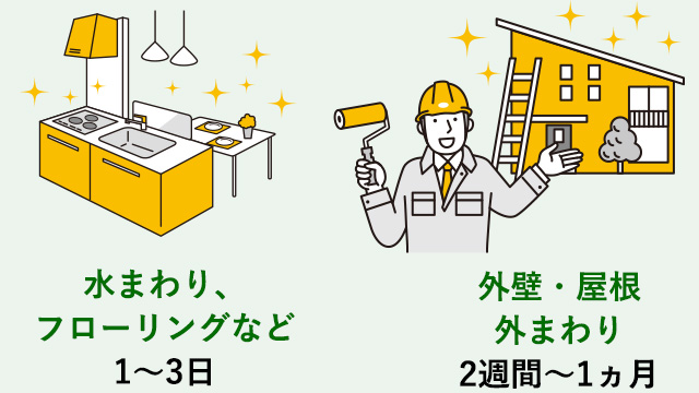 ただし、外壁や屋根などの外まわりをリフォームする場合は、工事に必要な工程が増えることや天候などの影響などを考慮して、2週間〜1ヵ月程度の工事期間を想定しておくと安心です。