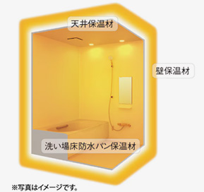 浴室全体を包み込む保温材が、天井・壁・床をしっかり断熱。外気の影響を受けにくく、入浴中も入った直後も、あたたかさが長時間続きます。寒い冬でも快適なバスタイムを実現します。