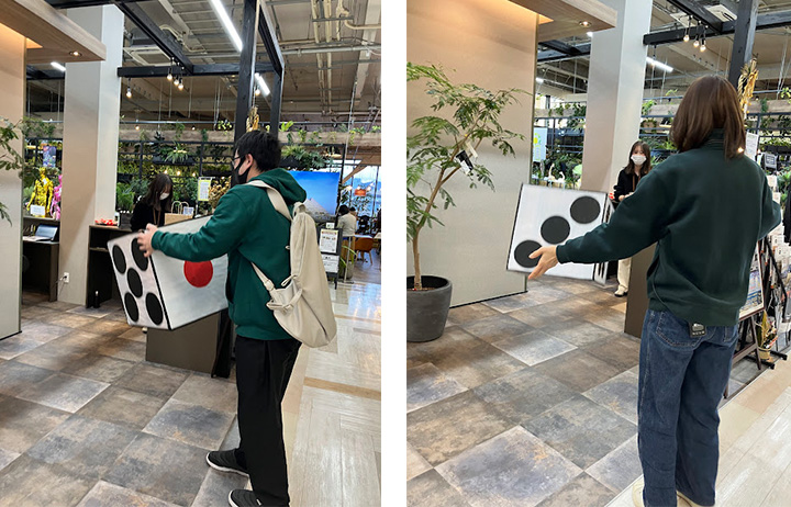 サイコロを振って出た目の数だけ、ショールーム前のカフェ「緑菜七彩」のドリンクチケットをプレゼントしました。