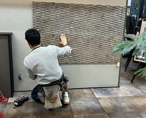 ウッドワンのデザインウォール不燃パネル石目柄を取り入れ、落ち着きのある上質な雰囲気を演出しています。