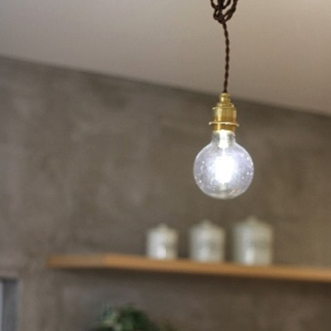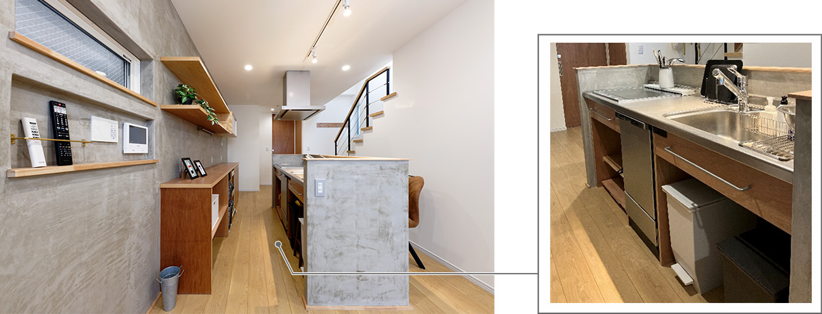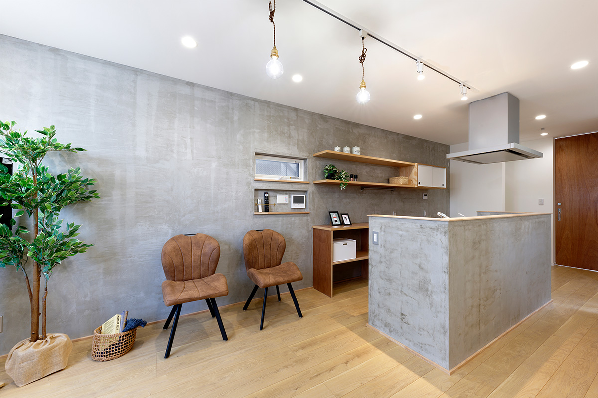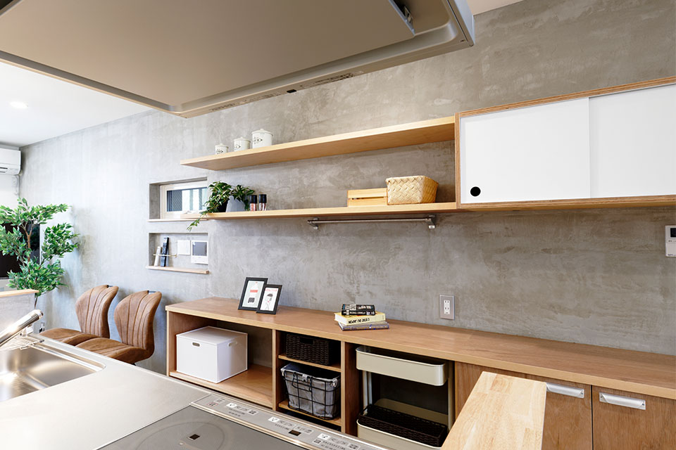 キッチンの造作キャビネットや壁はモルタル左官仕上げにしました。