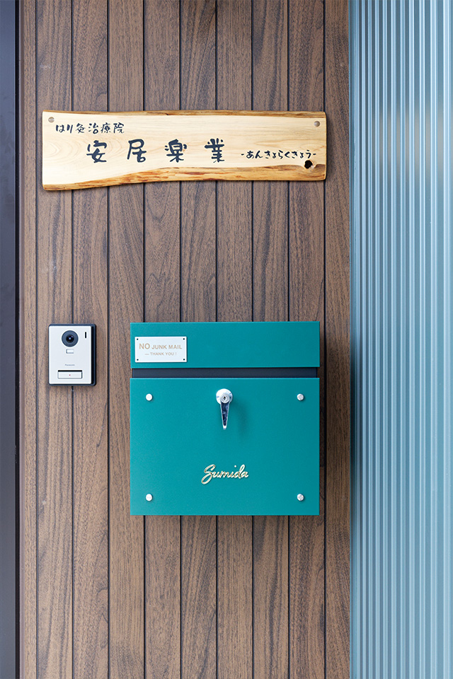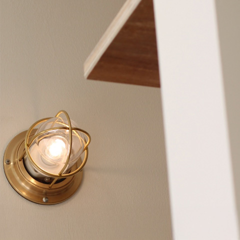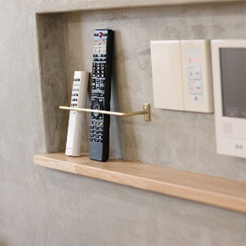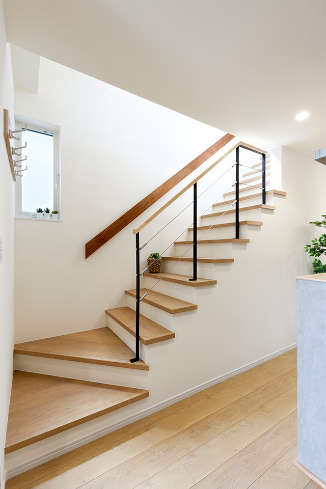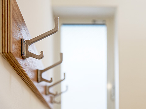3階への階段の昇り口に段差を利用して身長差のあるご家族がそれぞれの場所にかけれるようにフックを取り付けました。