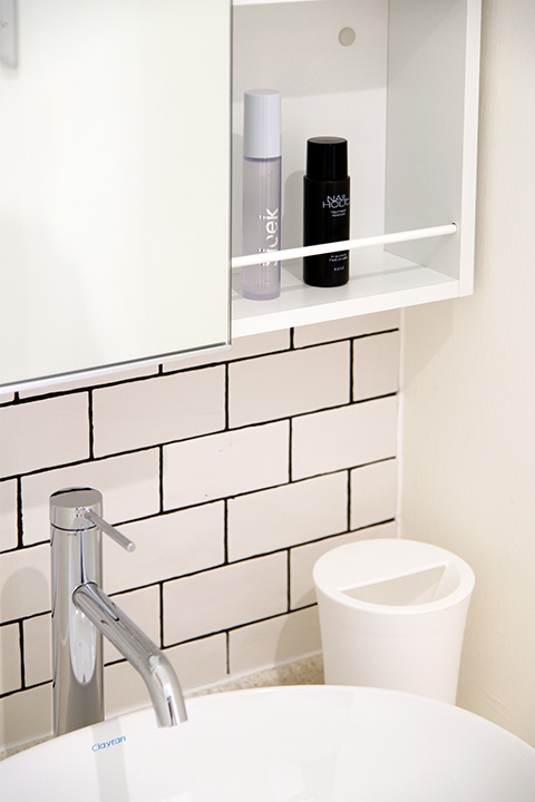 タイルと真鍮のタオル掛けが際立ちます。