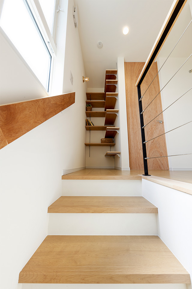 階段を昇った先には本やおもちゃなどが収納できるように可動棚を設置しました。