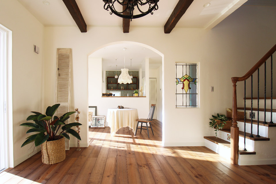壁には柔らかな光を包み込む漆喰を、足元にはフランスの風土が育んだボルドーパインの無垢フローリングを。