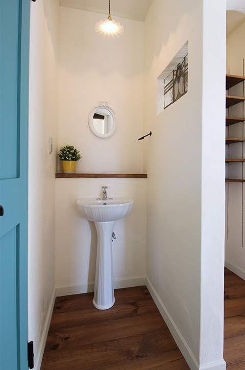 外から帰ったらすぐに手洗いできるように洗面スペースにペディスタイルシンクを設置しました。